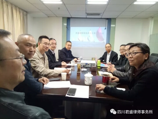 2017年10月25日下午,君盛律师事务所“积极贯彻十九大精神”学习会议在君盛会议室拉开帷幕。四川省政协委员、律所主任杨志男律师,成都市都江堰市政协常委、副主任李祝辉律师,君盛所高级合伙人杨咏松律师、汪正律师、丁庆林律师,以及杨红律师、黄兴建律师、陈建福律师、刘海燕助理等律所部分律师共同出席会议。会议由党支部书记、高级合伙人贺鹏飞律师主持。