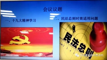 本次会议以“不负使命,砥砺前行”为主题,旨在更好的领悟十九大精神,更好的把握依法治国的主动脉。本次会议主题为:1、学习十九大报告精神;2、学习《公司法解释(四)》以及《对婚姻法司法解释(二)》第24条的最新答复;3、《民法总则》关于诉讼时效适用问题的探讨。