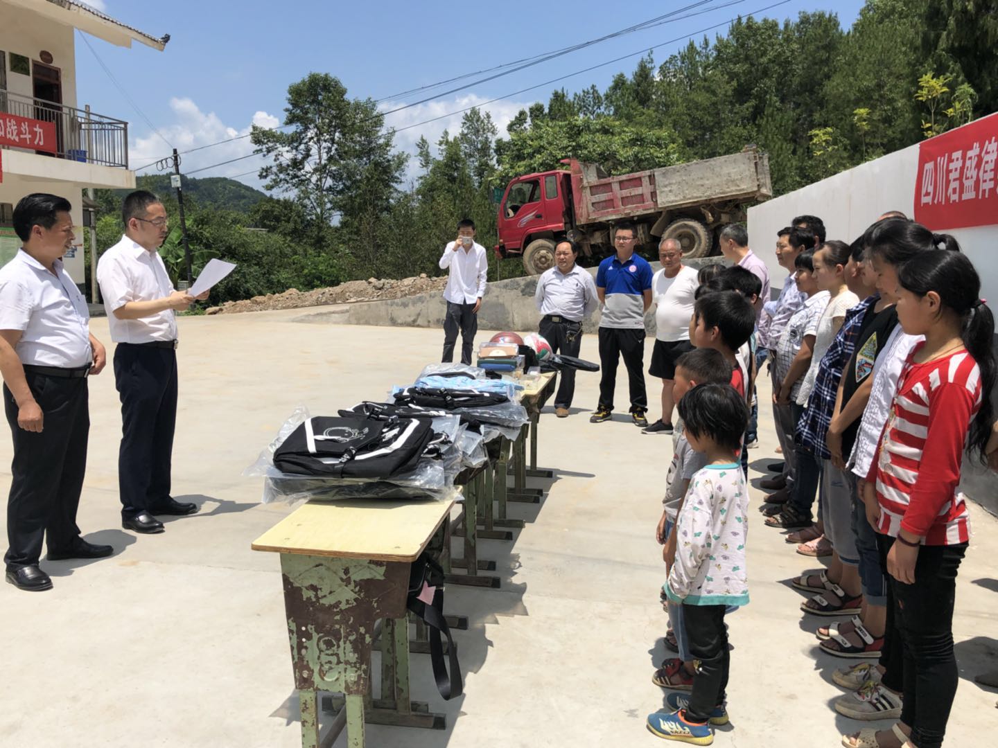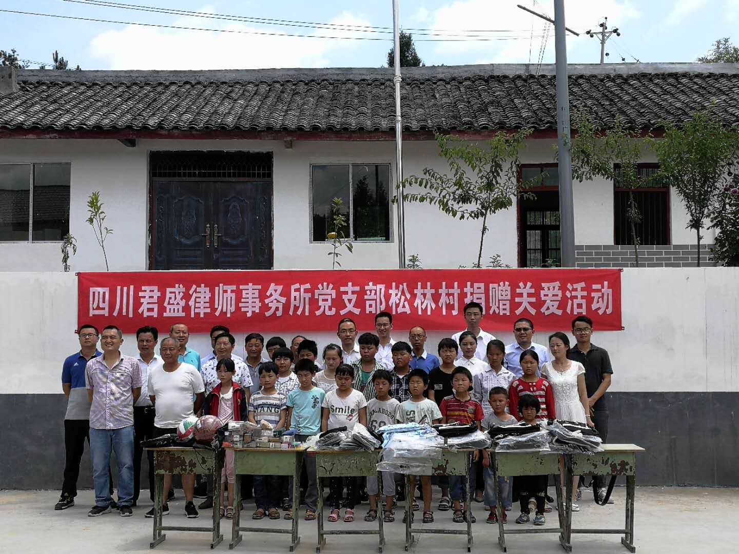 君盛律师事务所帮扶团队首先对松林村小学的每一位学生捐赠了书包、文具和体育用品。