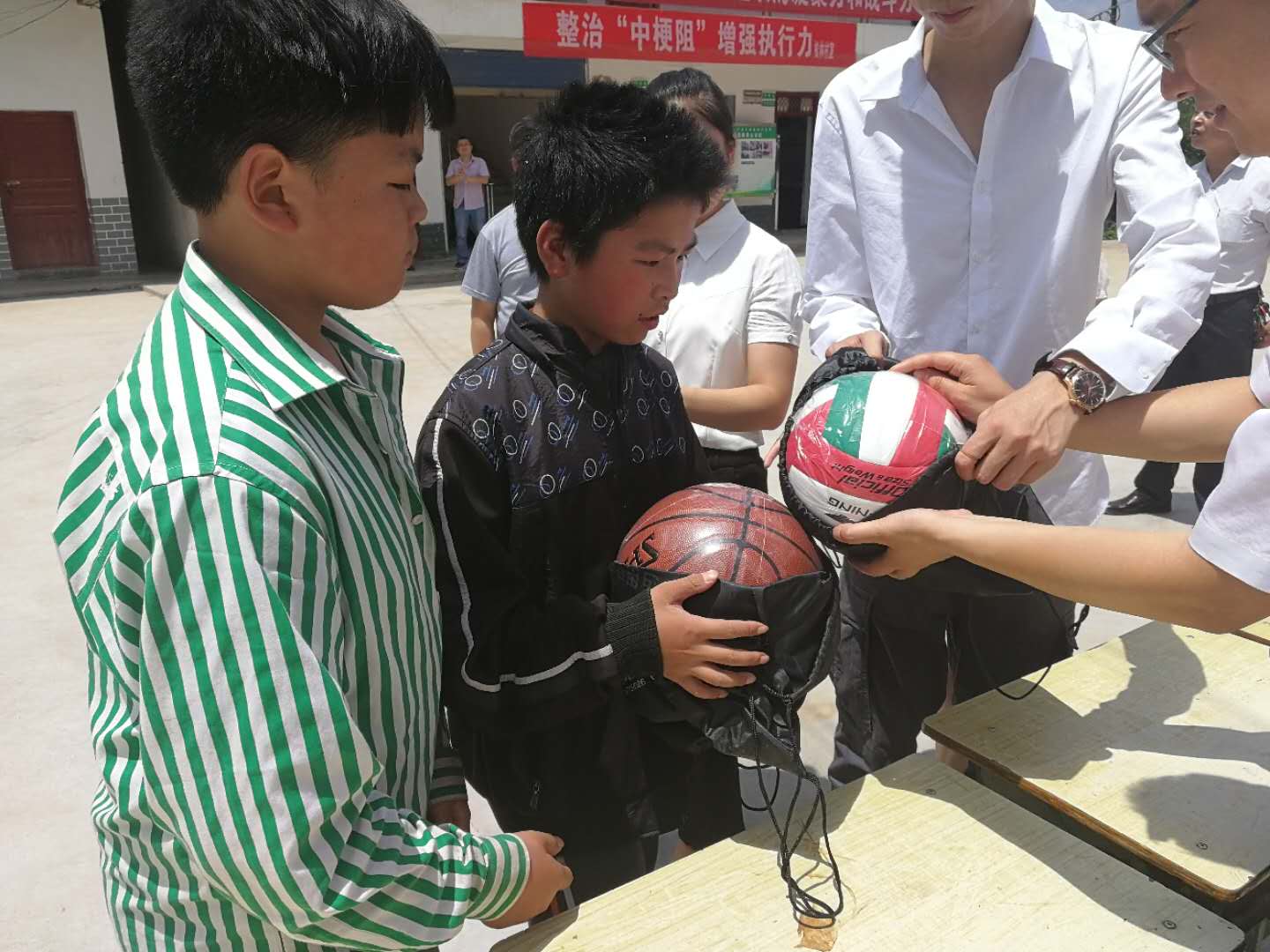 村小学的孩子们领取捐赠物品。